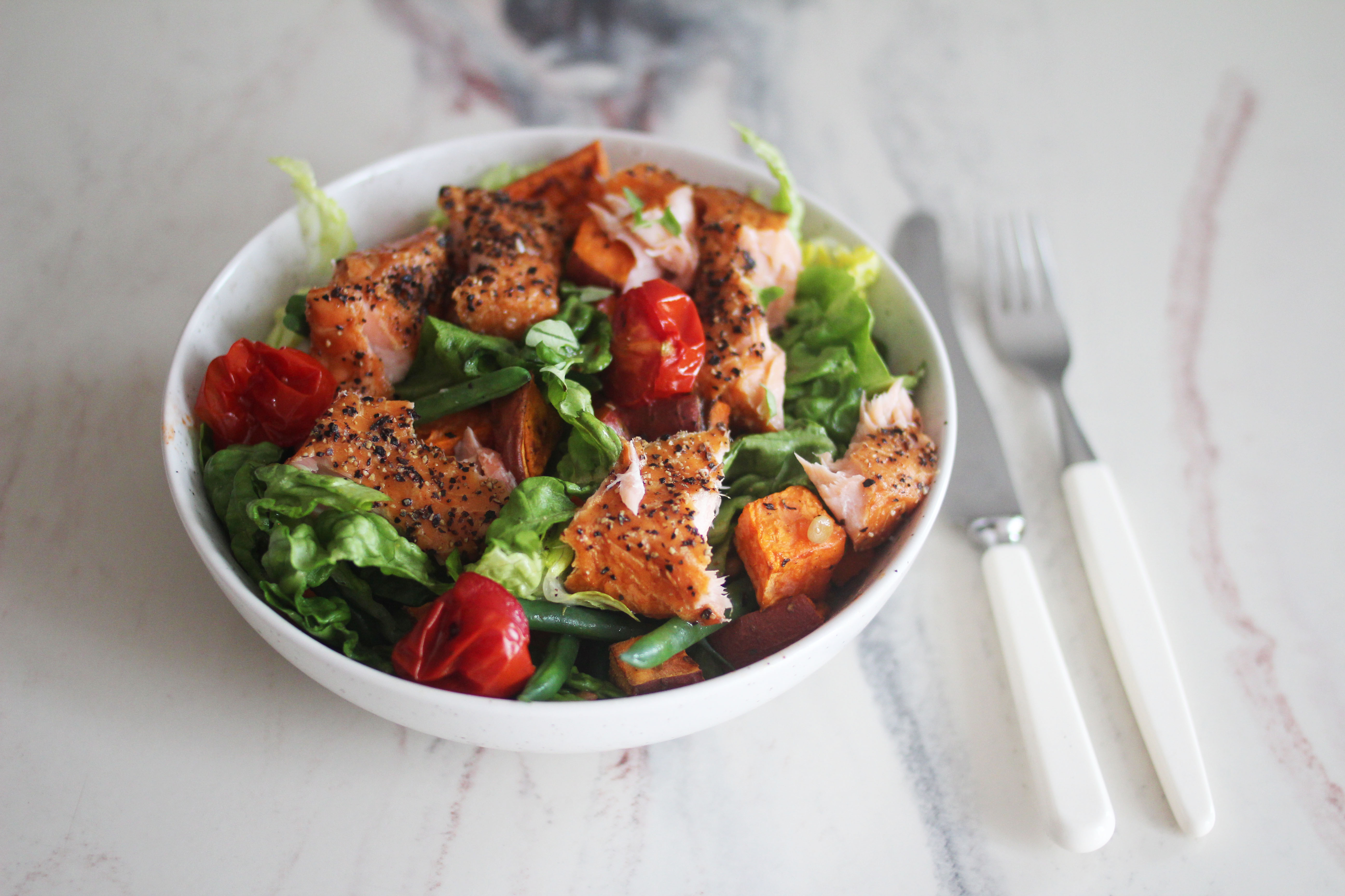 1. Ovnsbakt laks er enkelt å lykkes med, og sammen med linsesalat med bakt søtpotet og lune cherrytomater har du et sunt og godt måltid som både metter og smaker.